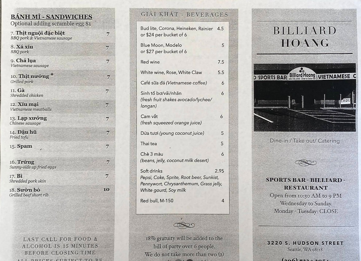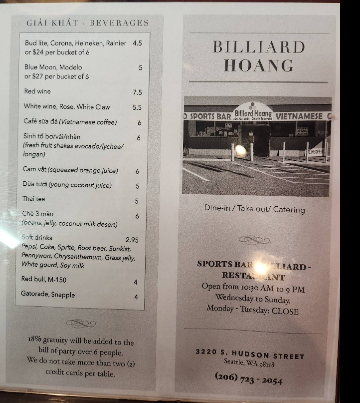 Discover the full Billiard Hoang Restaurant menu, offering a wide variety of authentic Vietnamese cuisine in Seattle. From flavorful pho and fresh spring rolls to hearty rice plates and noodle dishes, this restaurant is known for its rich taste and affordable prices. Whether you’re planning a quick meal or exploring new Vietnamese flavors, this guide provides updated prices, popular menu items, and everything you need to know before visiting Billiard Hoang Restaurant.