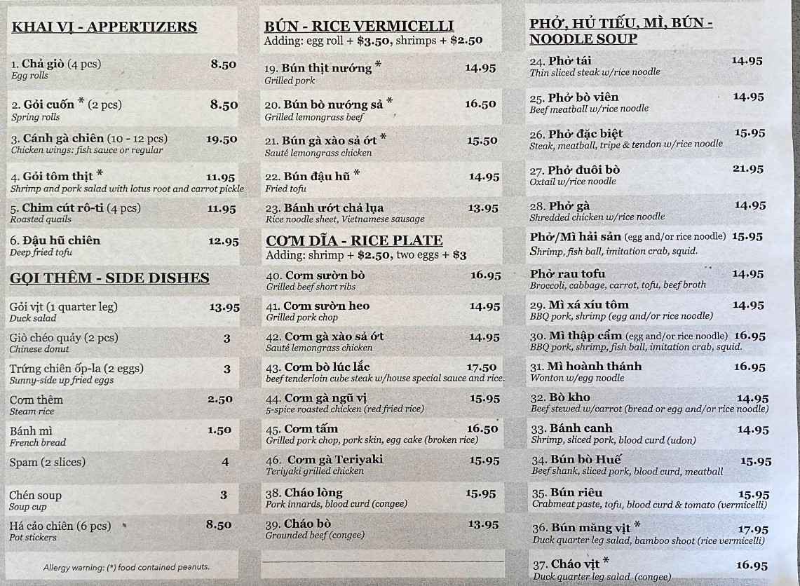 Always a solid spot to stop in for a meal. You can’t go wrong with the pho, salad rolls, or banh mi—everything is fresh, flavorful, and consistently good. The service is always personable and welcoming, which makes the experience even better. A reliable go-to for delicious Vietnamese food.